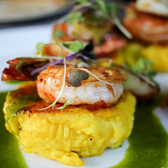 Dans une grande poêle, faites dorer les gambas et les échalotes ciselées dans le reste d’huile, 1 min de chaque côté. Réservez-les.