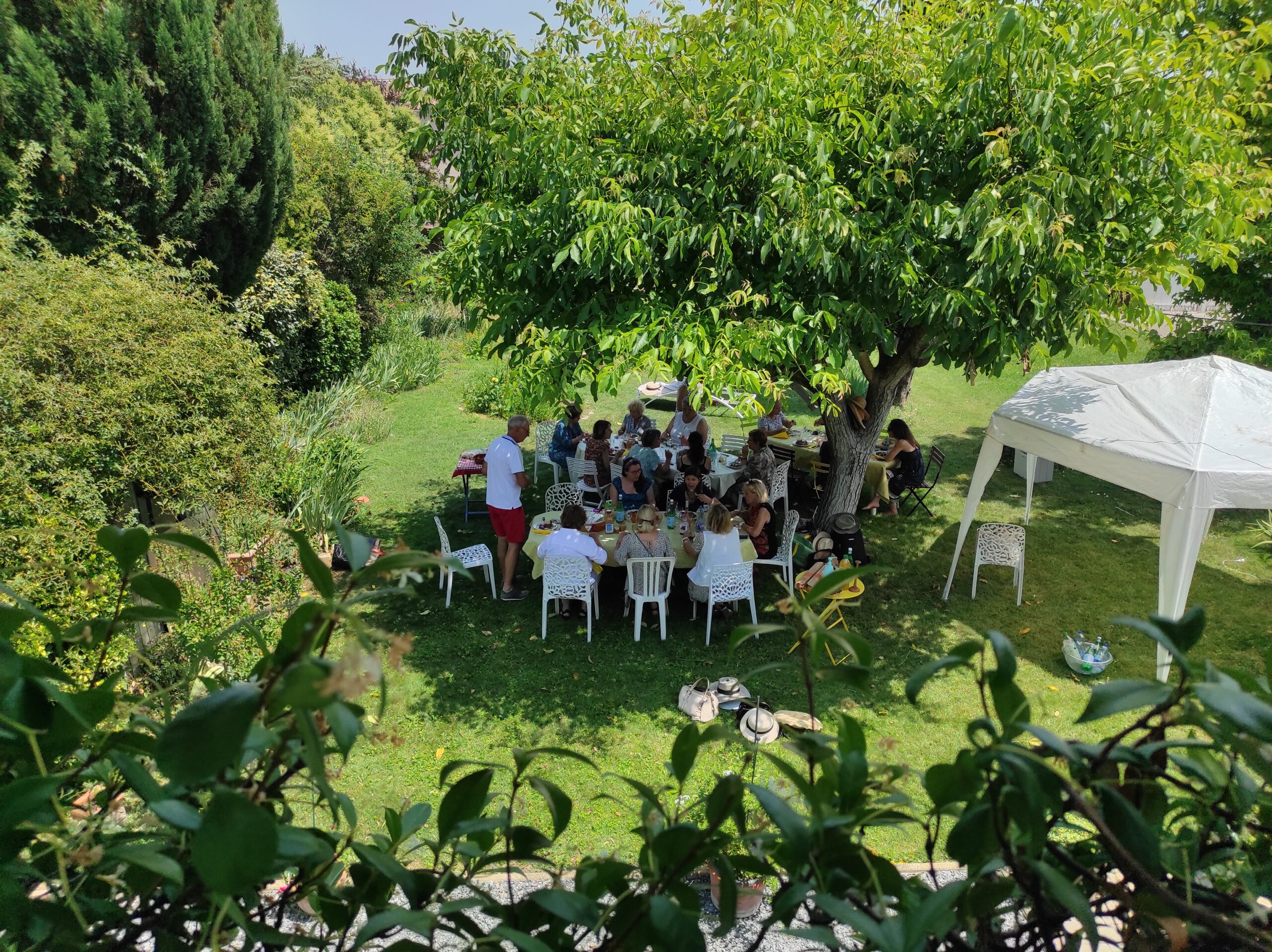 Dans le magnifique jardin de notre présidente Nathalie, avec pour l’occasion la douceur rafraîchissante des brumisateurs, nous étions 25 participants pour fêter la clôture de l’année autour d’un buffet composé de spécialités italiennes apportées par chacun des convives : il danubio salato, i lumaconi alla crema di melanzane, la torta di carciofi, le polpete di melanzane, l’insalatina di polpa, la panzanella… avec en apéritif un vin de citron de Sicile, concocté par Nathalie. Delizioso…